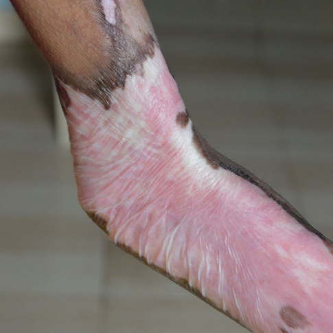 Pushpa came to just a few of the meetings; so not seeing or hearing from her some months later one of our social workers paid her a visit. Unfortunately, she found Pushpa with 2nd degree burns extending from her chin to her stomach and covering her arms. She said it was an accident caused by an oil lamp; but we later discovered that it was attempted suicide. The burns though only a few months old had caused contracture of the skin making it difficult for her to lift her head or straighten her arms; they were also extremely painful.